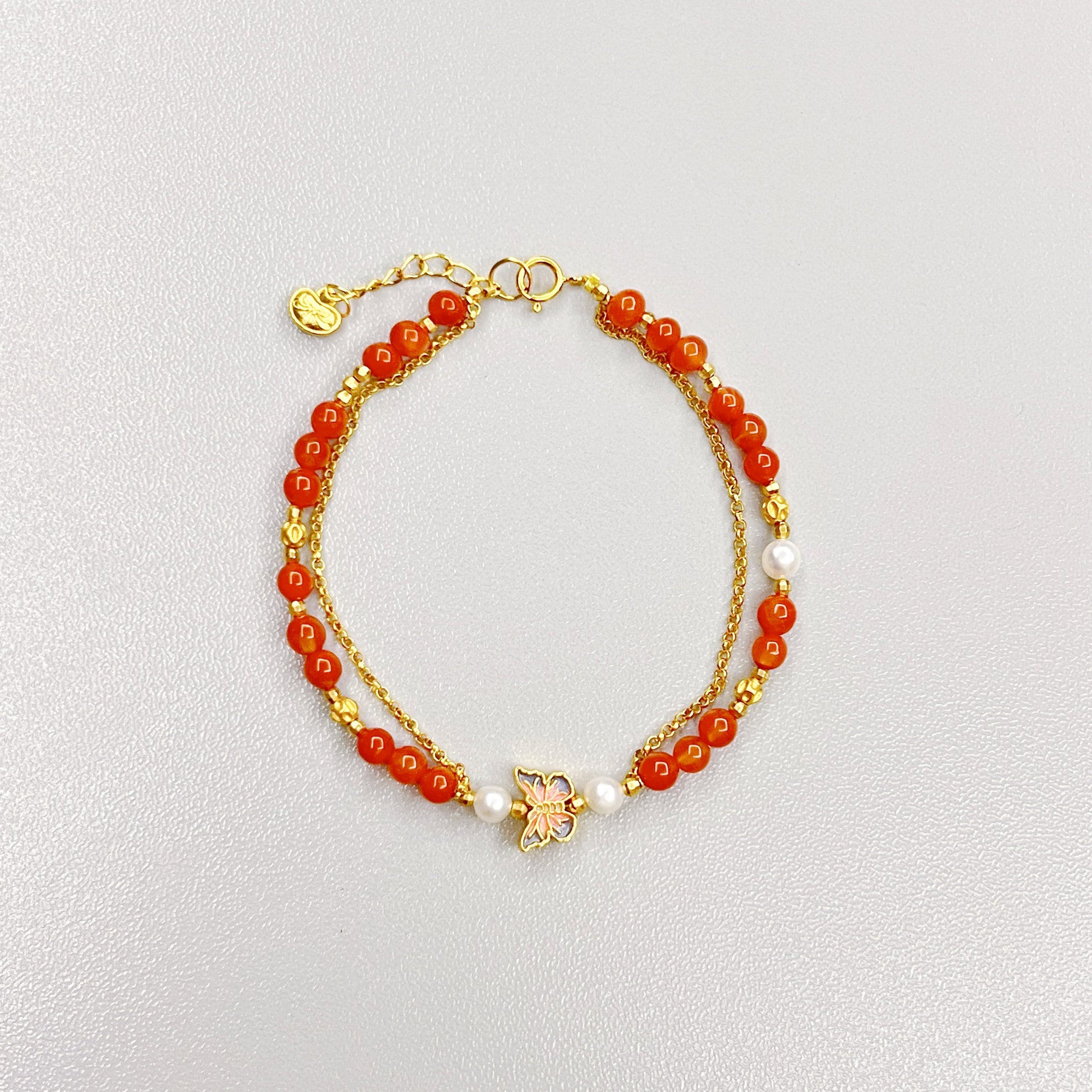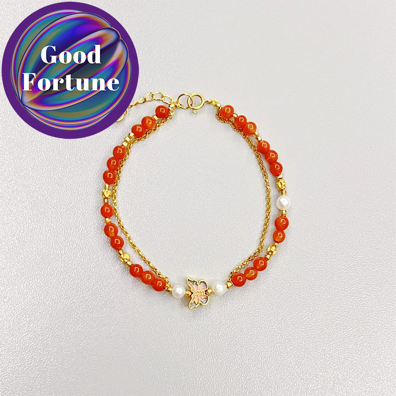This bracelet is a unique and exquisite piece of jewelry, crafted from a perfect combination of red agate, golden accessories, and small pearls, exuding an air of elegance and vitality. At the center of the bracelet is a delicate butterfly, symbolizing freedom and transformation.