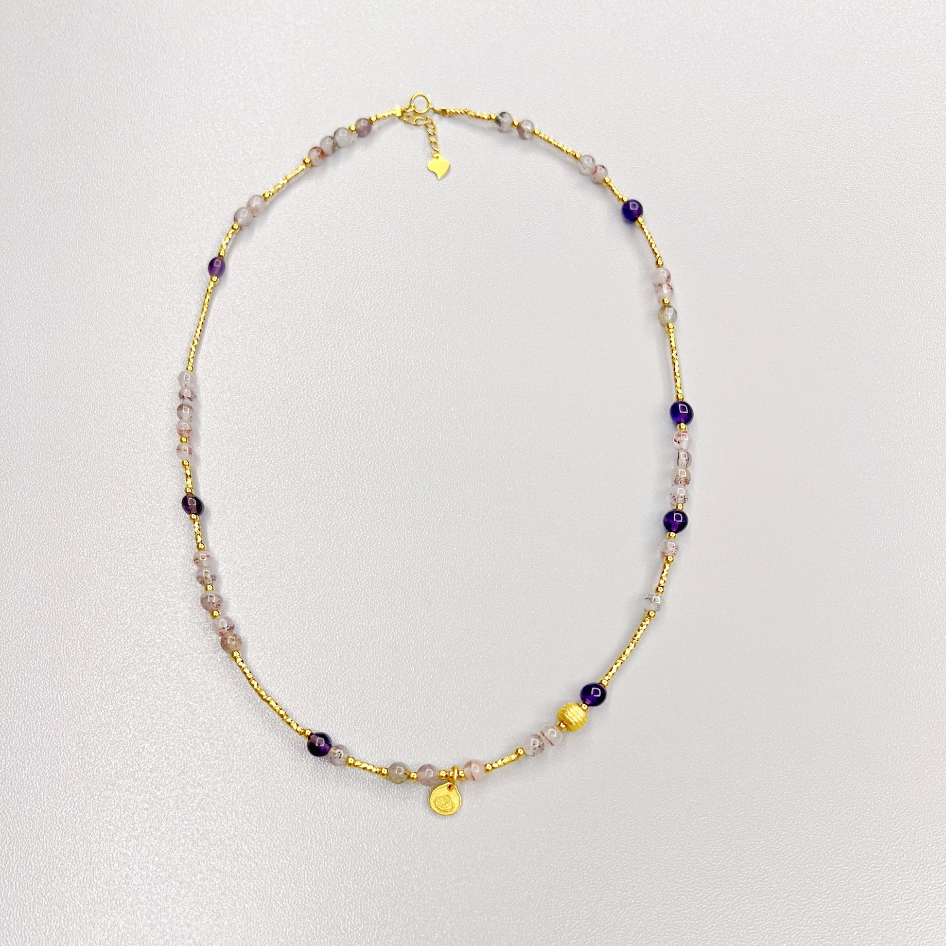 This necklace is meticulously crafted from Super Seven crystal and gold accessories. Super Seven, also known as "Sacred Seven," is a rare crystal that contains seven different minerals, possessing unique energy and beautiful appearance. Its colors typically present a blend of transparent purple, pink, and gold, radiating a captivating luster. The gold accessories add a touch of luxury to the necklace, making it even more eye-catching.