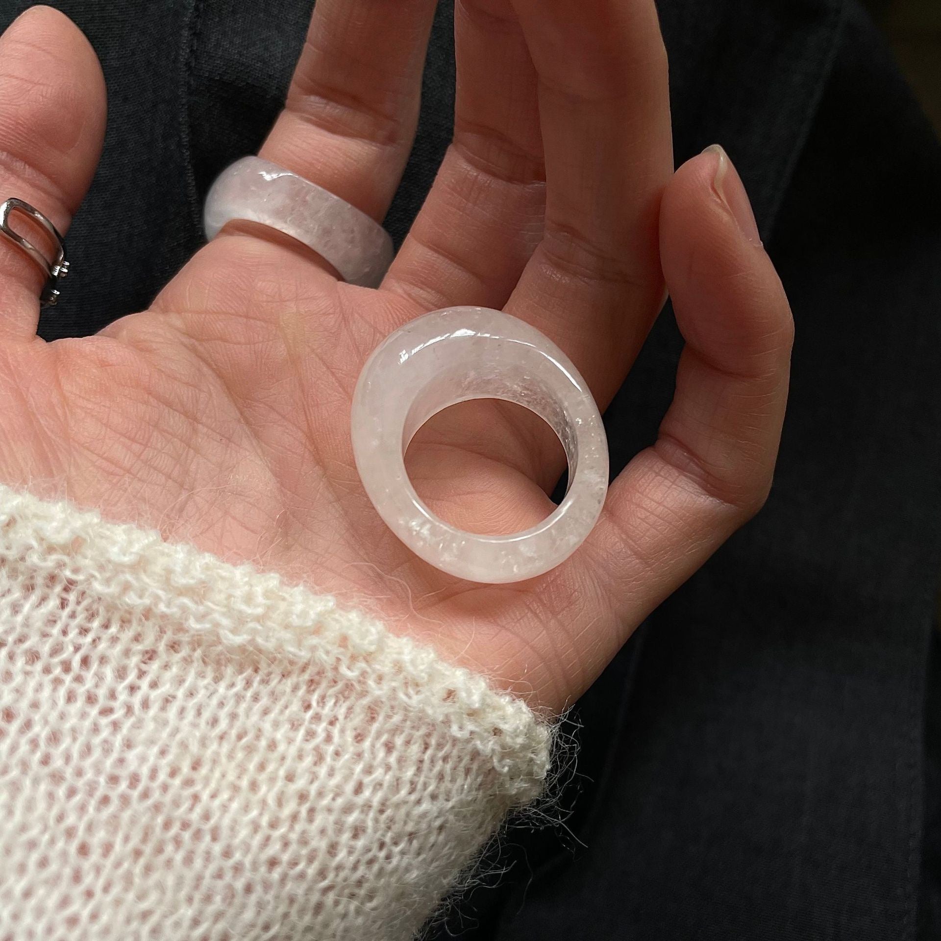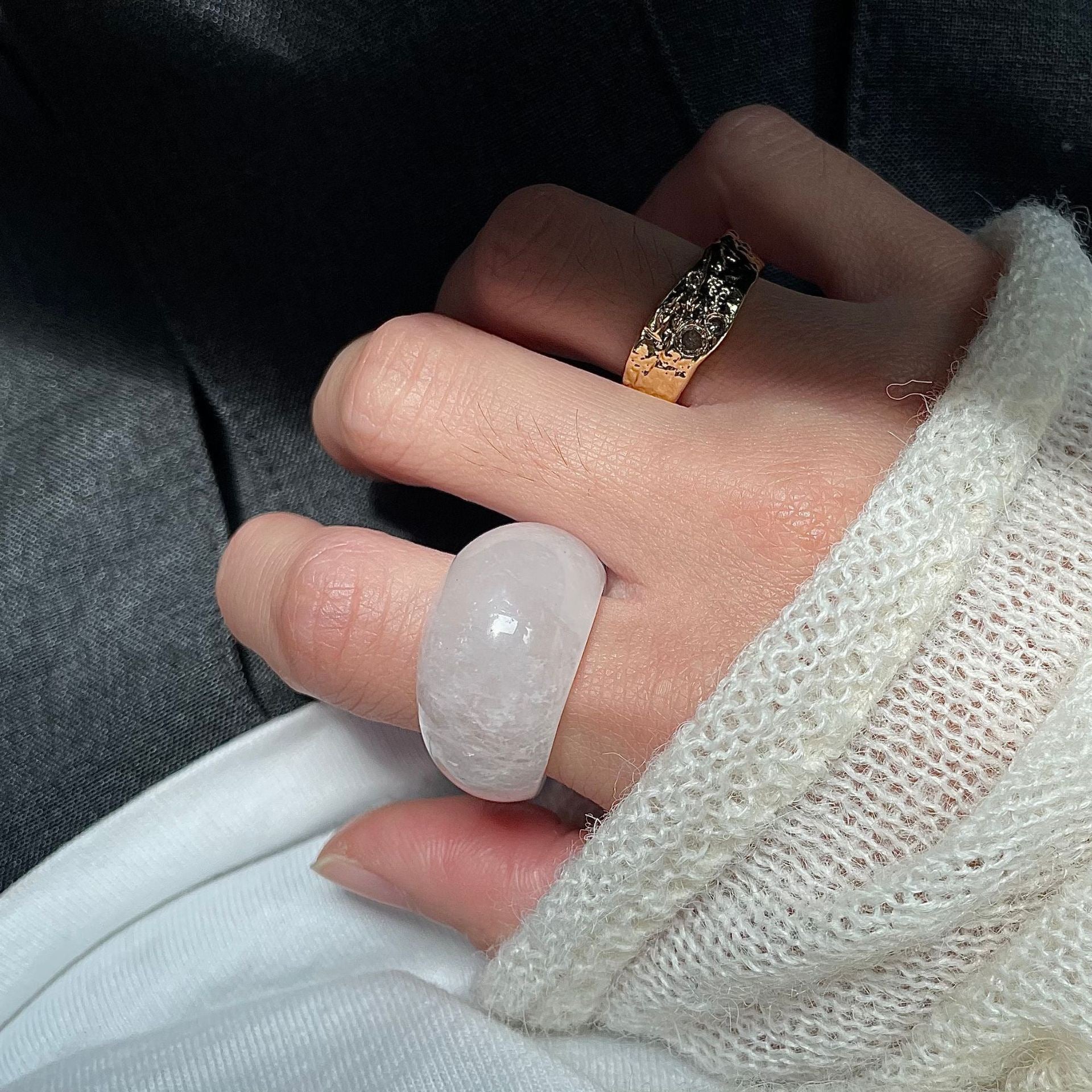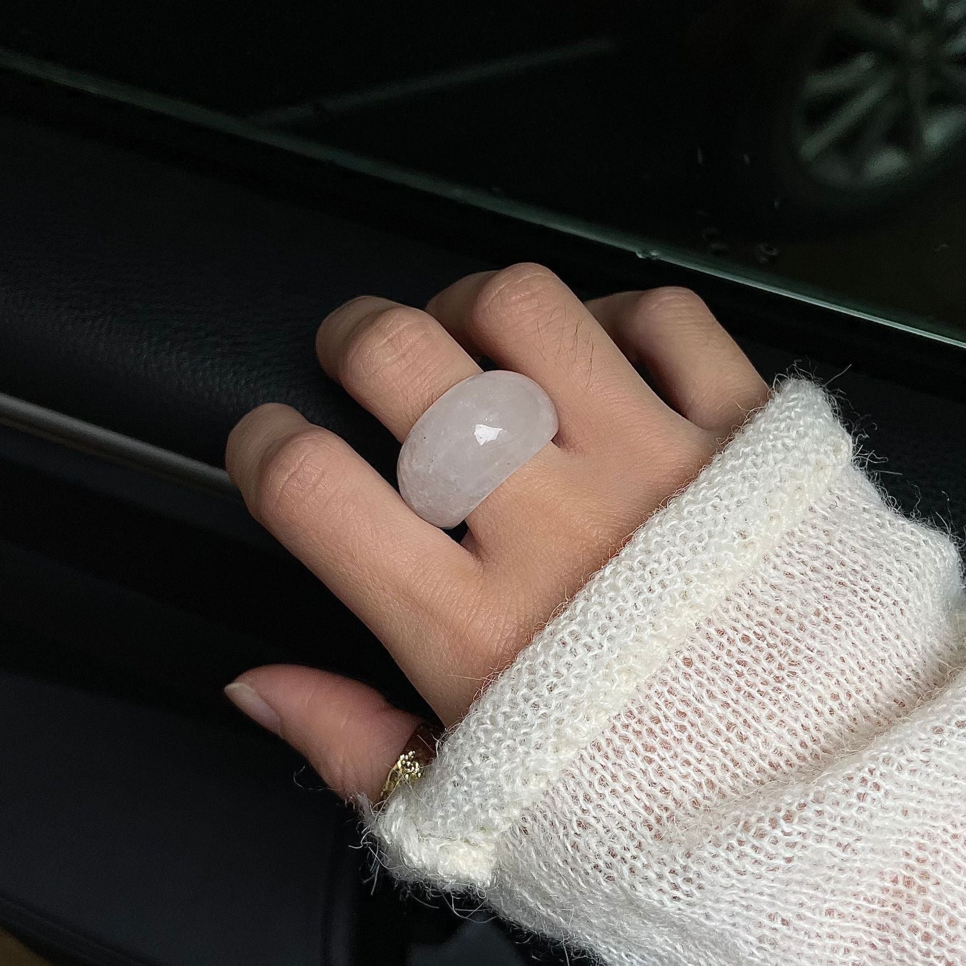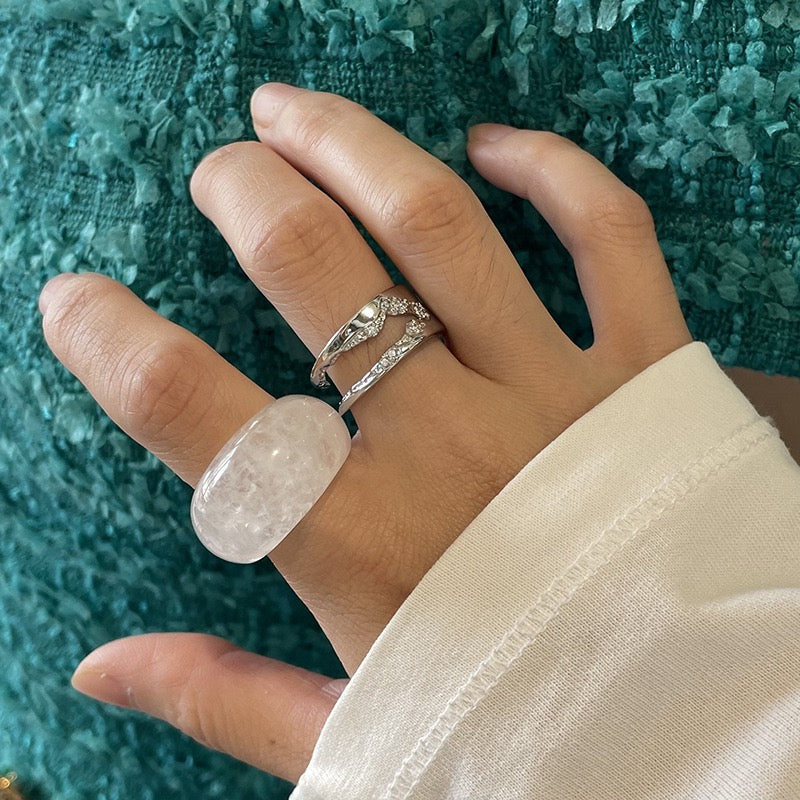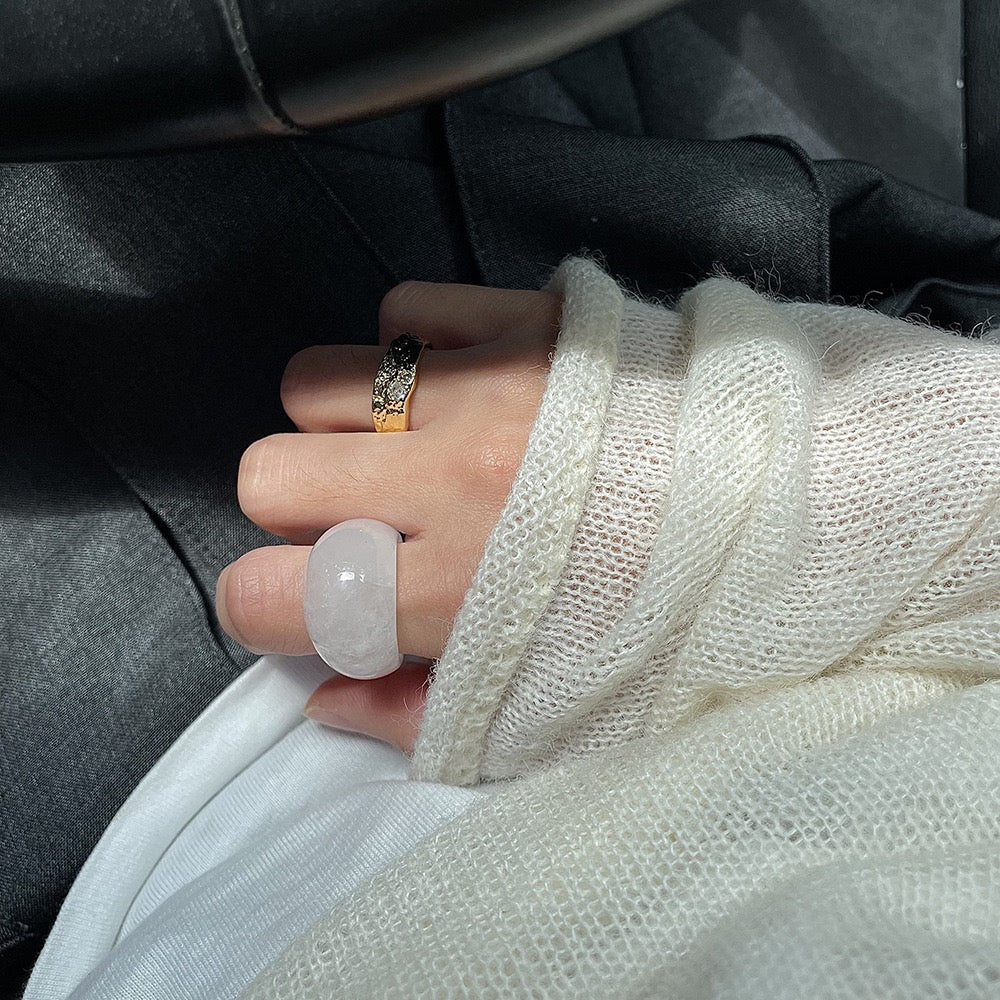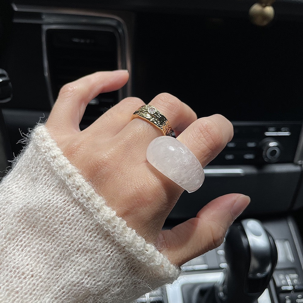 石英的淨度,宛如第一道陽光穿透萬裡無雲的天空,灑落在新雪之上,賦予戒指寧靜而迷人的光彩。它柔和而璀璨的光芒,毫不費力地吸引人們的目光,低聲訴說著大自然深處的寧靜與安詳。